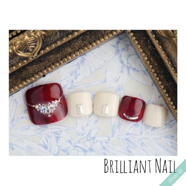 そのままでも素敵な赤のフットネイルですが、アレンジを加えてまた違う表情を満喫するのもGOOD。濃い目の赤とラメレッドを交互に塗った足先に、ストーンのドットアートをプラスして。大人ガーリーなルックがオシャレです。