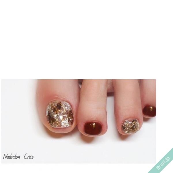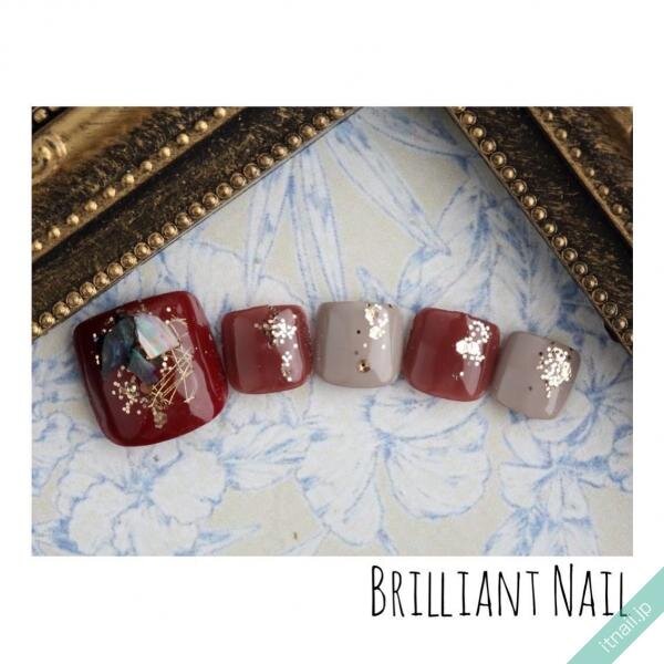 赤と相性のいいゴールドのグリッターに、大人っぽい色味のシェルをのせたオシャレデザイン。シックな色味に落ち着いたデザインが絶妙な雰囲気を作り出しています。大きいラメの粒が光を反射して、足元で存在感を発揮してくれそうです。