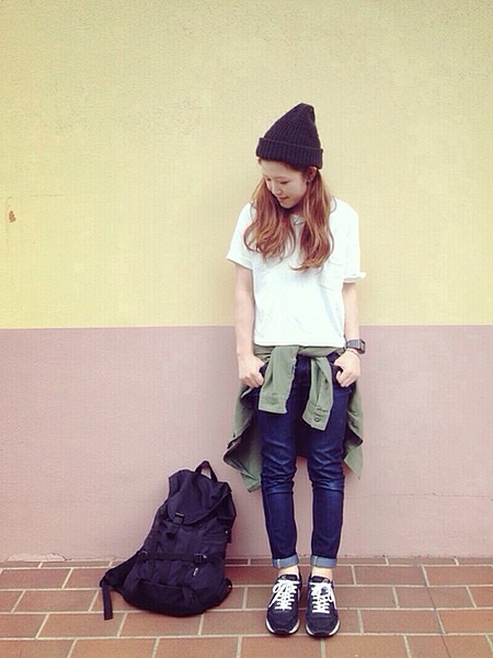 ニットキャップとスニーカーを合わせれば