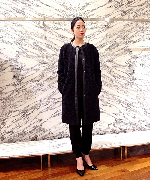既に定番になりつつあるチェスターコート。ポケットのフラップが高め設定で、すらりとした背高効果のある一枚。