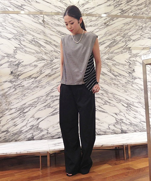 アシメントリーなフロントデザインで、好感度なフェミニンブラウス。裾をゆるやかなカーブにすることで、より女性らしい印象に仕上がっています。ワイドパンツやジョグパンツにおススメの一枚。