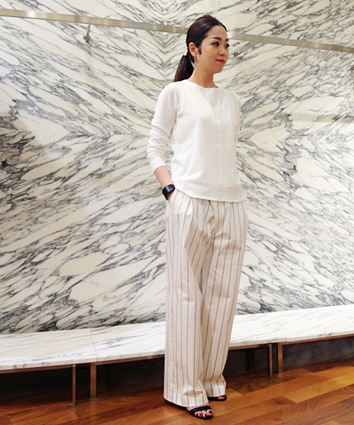 トレンドの70年代ディテールをとりこんだベルボトムデザインのパンツ。ノーブルな印象のホワイトをチョイスすれば、洗練された旬顔の着こなしに。
