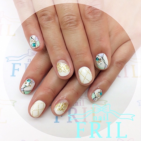 基本のホワイトのフレンチネイルも、細かいストーンなどを使用する事でとても華やかにまとめる事が出来ます。