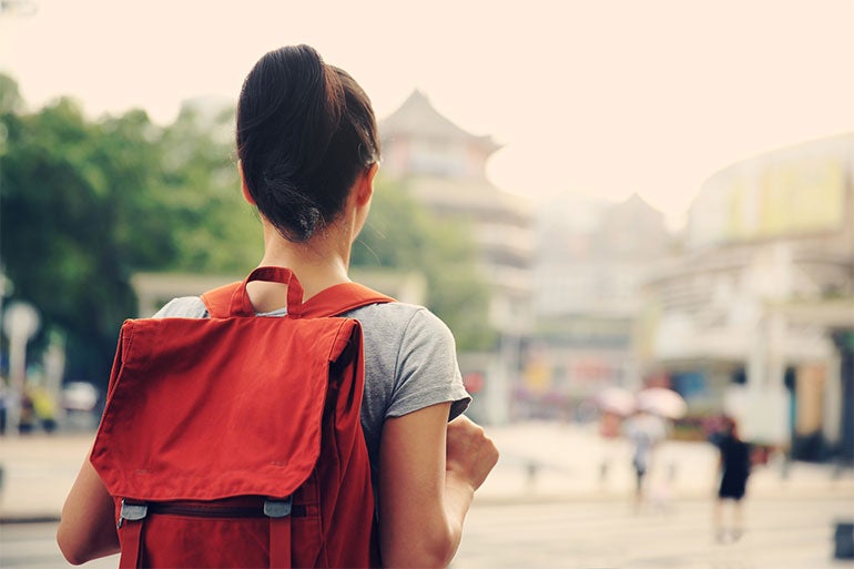 「バックパッカー」という言葉のイメージどおり、自由に動き回れる機動性の高さが特徴。両手が自由になるので、スマートフォンやガイドブックなどを手に、身軽に動くことができる。