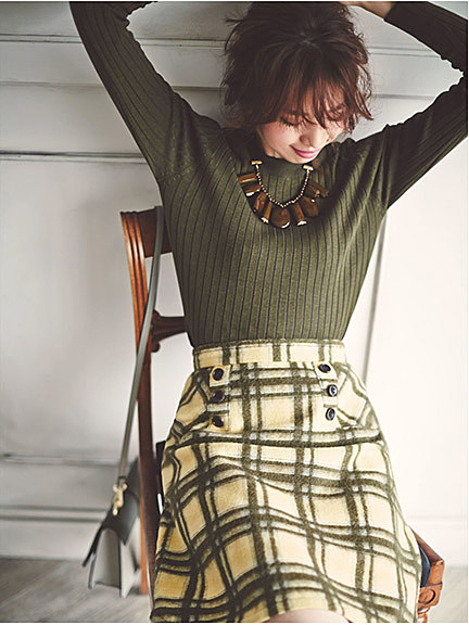 こちらはセットアップになっている上下のスカート。ニットスカートは毎年人気。チェック柄のスカート派さりげなくガーリーさをアピール出来ちゃうかも?