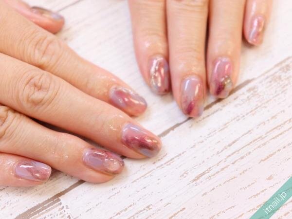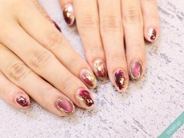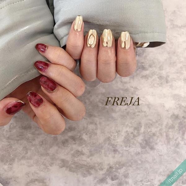 ムラをつけて施すもやもやネイルは、ボルドーで作るとクラシックな大人スタイルに仕上がります。目を引くミラーネイルとのアシンメトリーデザインでオシャレモードを際立たせましょう。