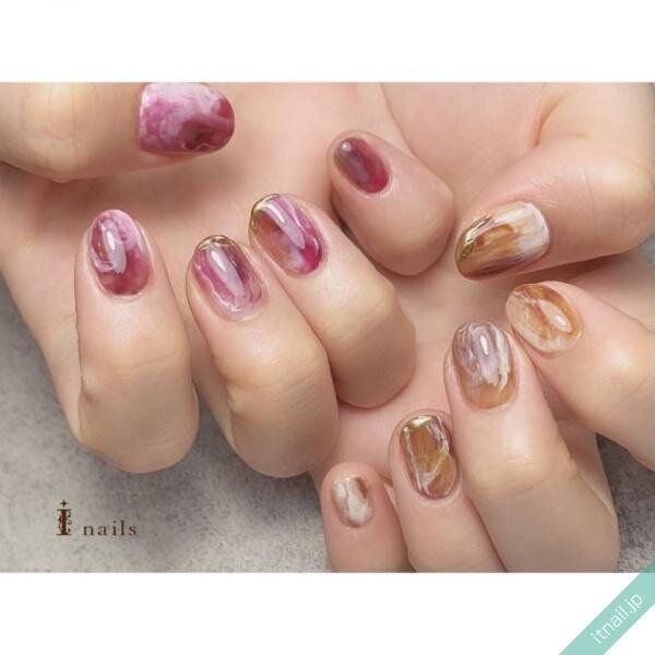 深みボルドーにホワイトをミックスさせたマーブルネイル。色同士が絶妙に混ざり合う様子に思わず視線を奪われます。左右で色違いにしたスタイルも大人かわいい。