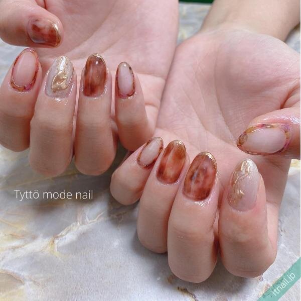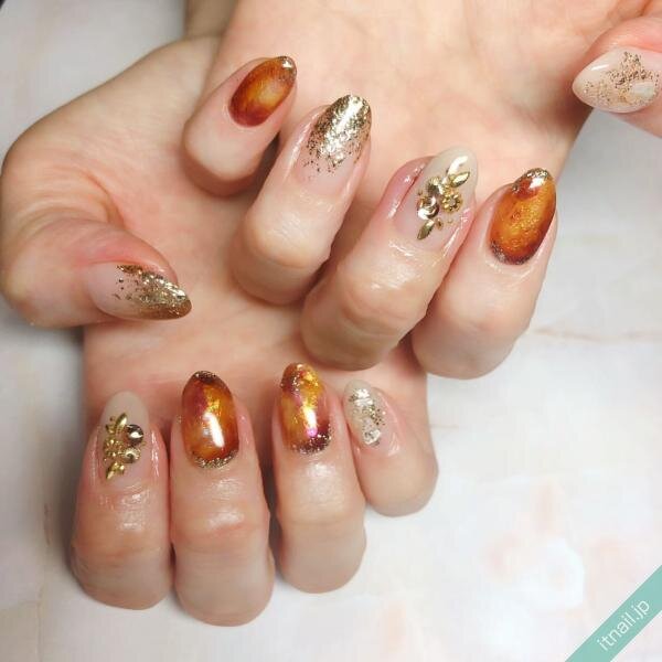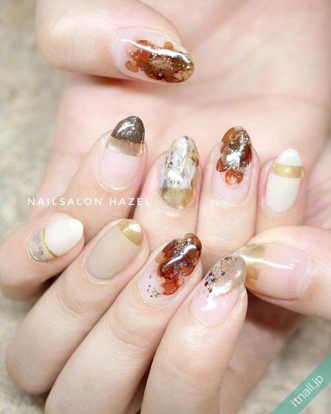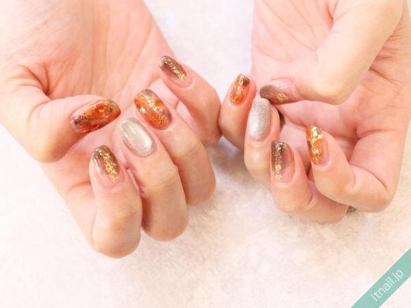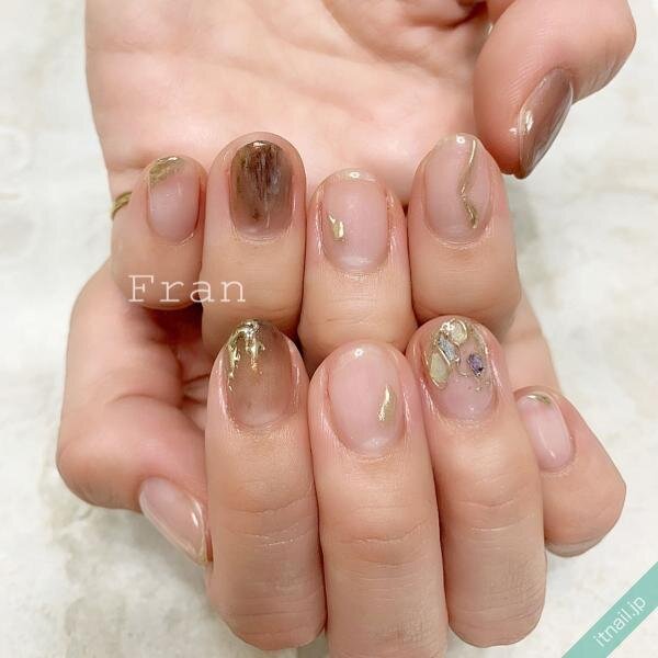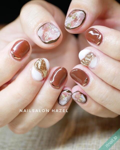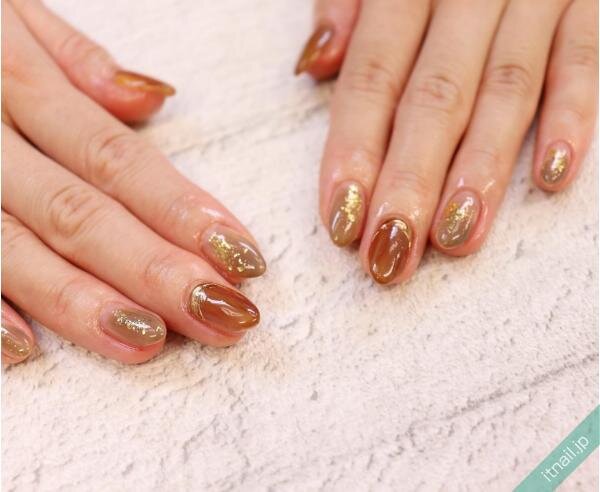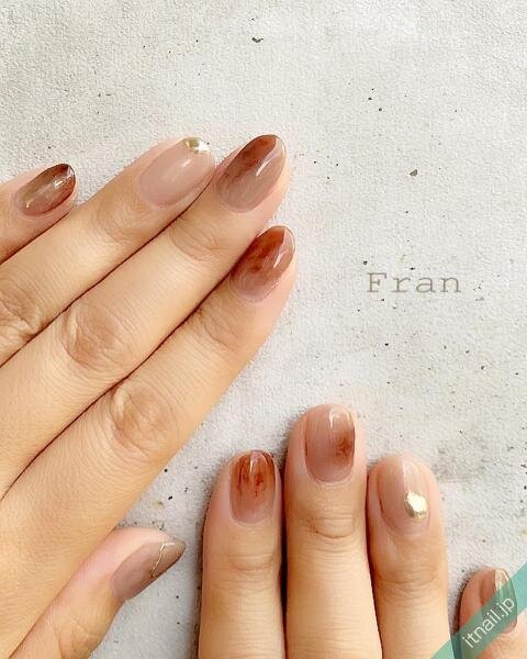 柔らかくぼかして描くブラウンのニュアンスネイル。これから冬へと向かう少し物寂しい紅葉の情景とリンクして、繊細な美しさを発揮しています。メタリックゴールドがアンティークなイメージを演出してオシャレ。