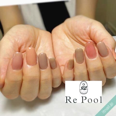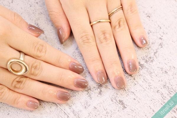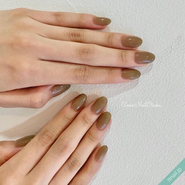 次にご紹介するのは、くすみ系クレージュカラーに深めのブラウンが落ち着いた印象のワンカラーネイル。
