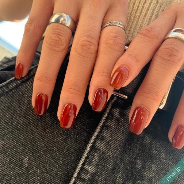 次にご紹介するのは、ワインレッドに近いブラウン系のワンカラーネイル。