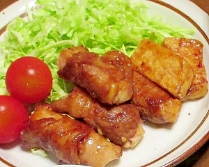 楽天レシピ:「冷凍豆腐の照り照り☆肉巻き 」より