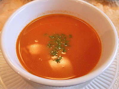 チキンスープにトマトペーストを入れたさっぱりしたスープです。
