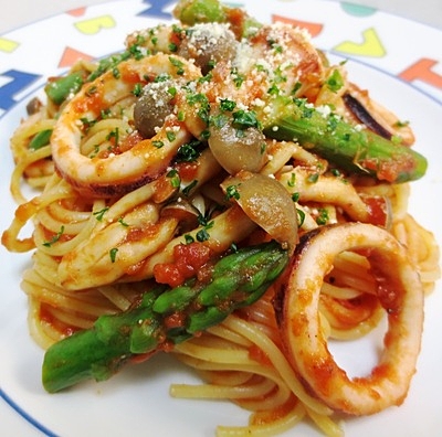 イカとアスパラのトマトパスタ