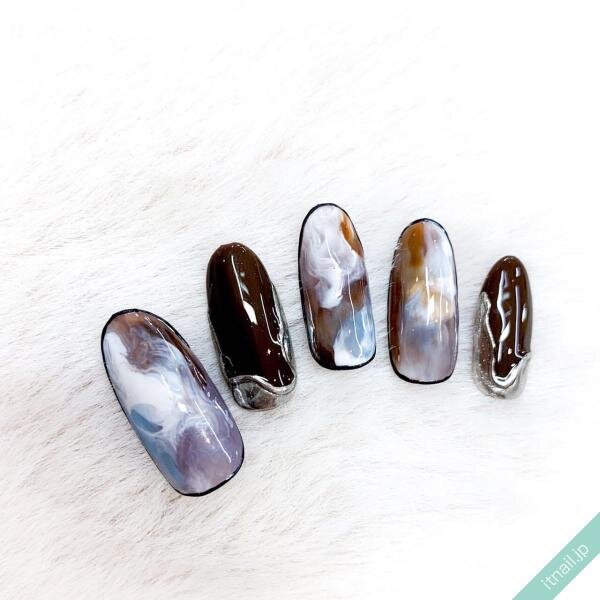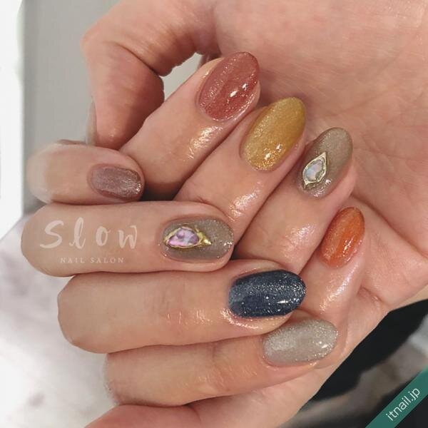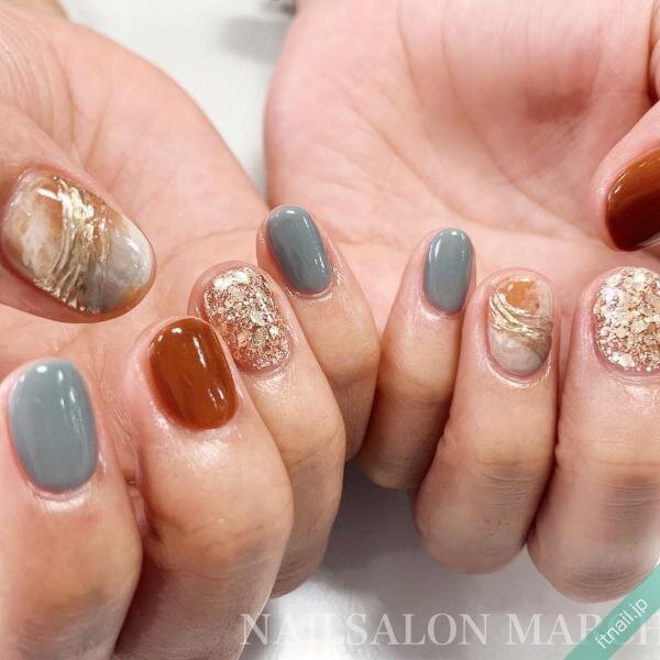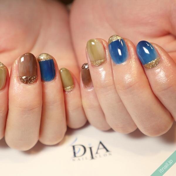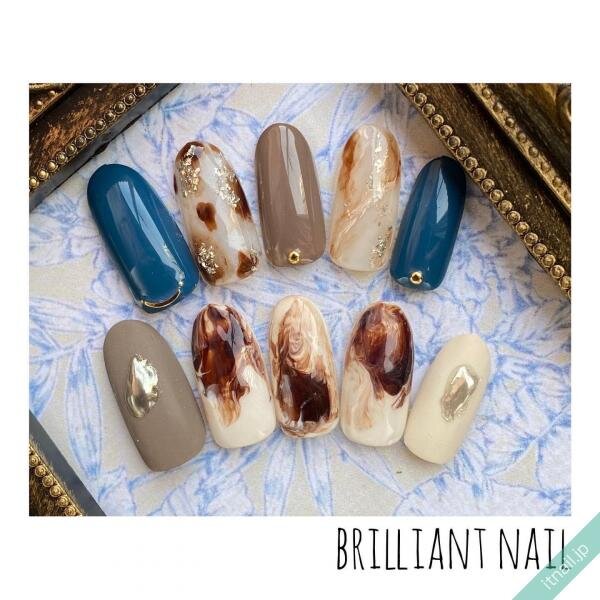 鮮やかなブルーにあたたかみのあるブラウンがかけ合わさったエレガントなネイル。爪先と根元に施したラメは二種類を使って印象をチェンジしているので、奥行きのある大人スタイリッシュなデザインにまとまっています。