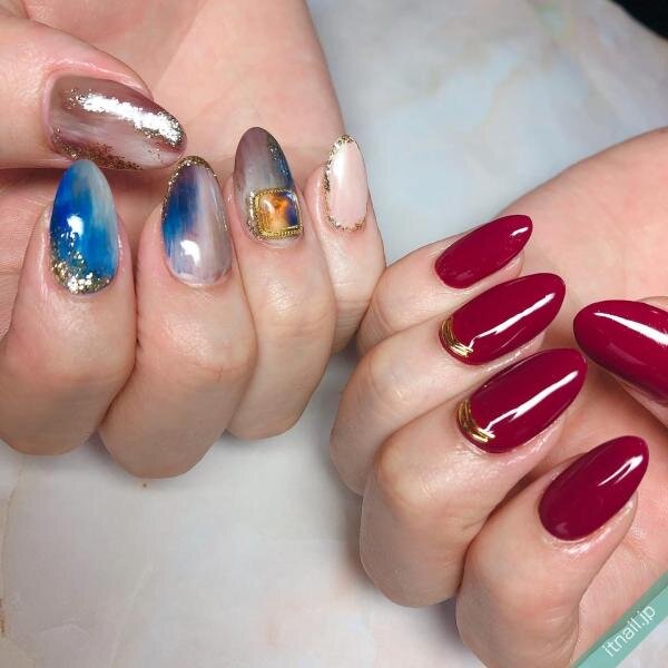 雰囲気が異なる二つのデザインをコーディネートしたアシンメトリースタイル。一方は鮮やかなレッドに、もう一方はブルーのニュアンスグラデーションをかけ合わせています。ハッとする配色のコーディネートが高貴な印象。