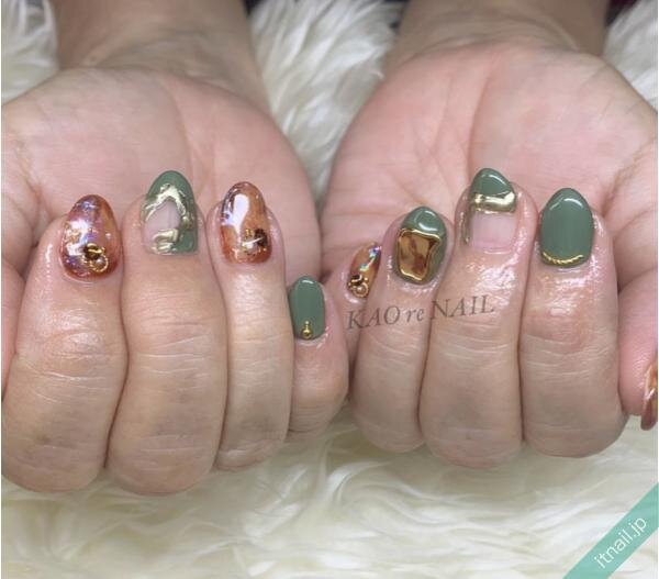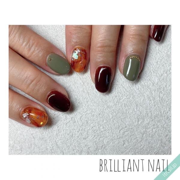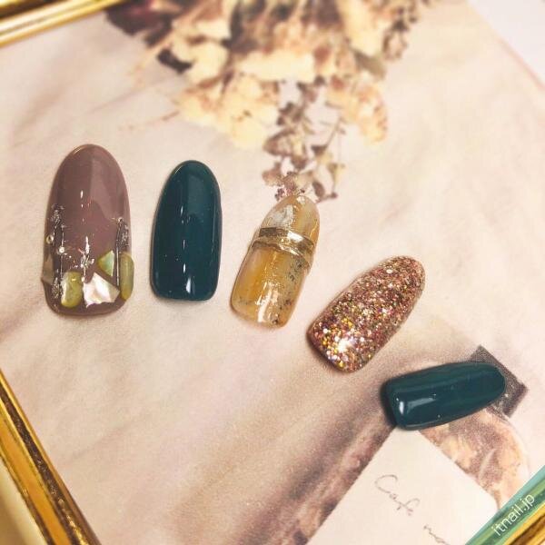 落ち着いた色味が魅力の深みグリーンに、シックなココアブラウンを使ったデザイン。きらめくグリッターや上品なシェルもオシャレに施して、ハイセンスなイメージを作り上げています。カジュアルなイエローが抜け感もあって◎。