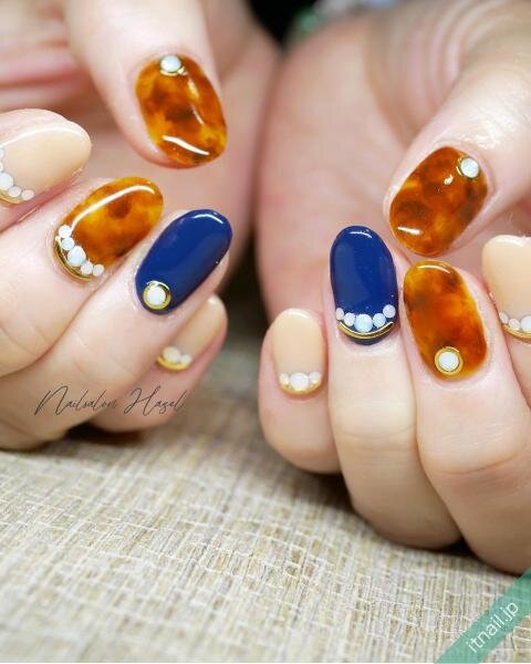 澄んだネイビーとべっこうの組み合わせは上品なイメージ。ネイビーは寒色の中でも落ち着いていて品のあるスタイルを叶えてくれるので、清楚で高貴な指先へと導いてくれます。オパールのデコレーションもさりげなくてオシャレ。