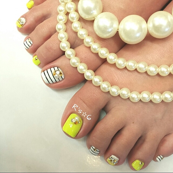 今年注目のカスタードイエローはフットネイルでも大活躍!ドット柄やジュエリーパーツなどいろんなデザインに合わせられるカラーです♫