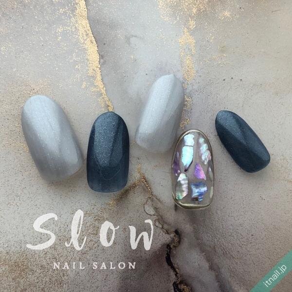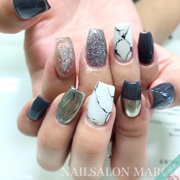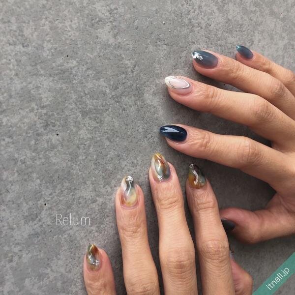深みネイビーにホワイトでニュアンスをつけた高見えデザイン。大理石のようで、宇宙から見た地球のよう。芸術性が感じられる見た目が指先のオシャレさを格上げしています。