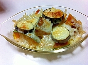 なす+ズッキーニ+ベーコンのグラタン風レシピ。