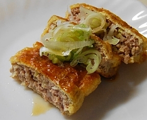 油揚げにたっぷりのひき肉を詰めて、じゅわーっと肉汁が溢れます♪
