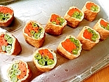 油揚げでにんじんといんげんをくるくる巻いて、カラフルな一品♪