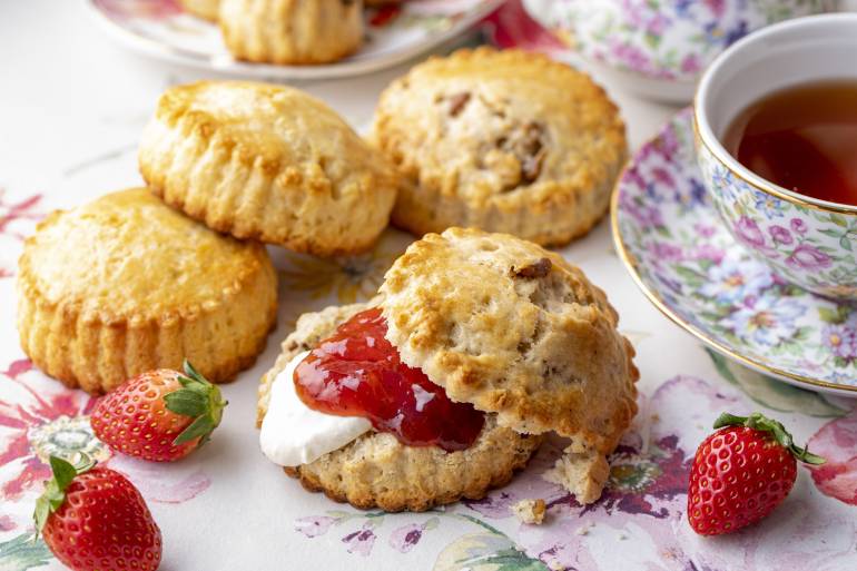 ヘッドベーカーの湯田剛史(ゆだつよし)氏おすすめのフレッシュスコーンは2種類。外はさくっと、中はふんわりと焼き上げた「アールグレーと胡桃のスコーン」と、小麦粉とバターの香りをストレートに楽しめる「プレーンスコーン」はクリームやジャムとの相性抜群。