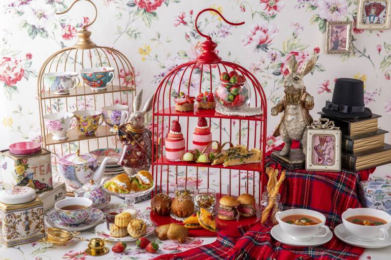スイーツは大粒苺がたっぷり配された「アリスのローズハート 苺タルト」、苺とミルク、ヨーグルトのシェイク「Drink me」やフレッシュ苺など約10種類をお好きなだけオーダー可。可愛い中国帽子を纏ったうさぎにいざなわれ、各テーブルにはクラシカルな茶器スタンドが配されるなど、おしゃれでノスタルジックなシノワズリ風お茶会はいかがだろうか。