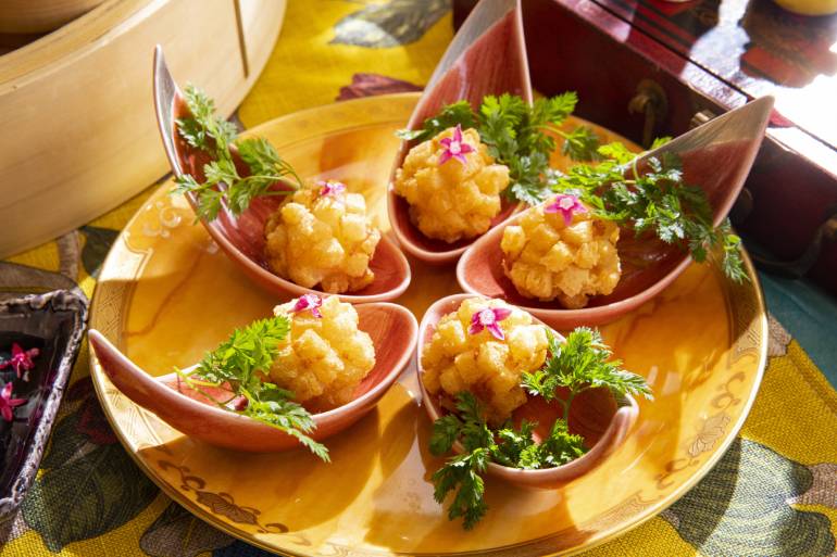 シェフズスペシャルは鮮やかな緑色の「グリーンピースのクリームスープ」、トランプのハートやダイヤマークを配した「3種きのこと肉団子の醤油煮込み」、さくっとした歯触りの「紫芋餡入りライスペーパー巻き揚げ」とウーロン茶ゼリーを和えた「春雨サラダ」で、アリスを感じる世界を満喫しよう。