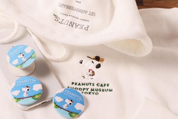 記念グッズは缶バッジ、ポップソケッツグリップ、スウェットパーカーの3種類です。"ビーグル・スカウト"のスヌーピーをモチーフにした1周年限定デザインです。