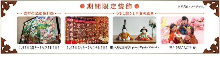 1月中は新春のお祝いにふさわしい吉祥文様の打掛を展示、2月以降は早春を彩る「つるし飾り」を、そして、3月にはひな人形やあかり絵を予定。季節とともに、子供の健やかな成長を願う景色が展示される。