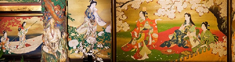 日本画作家の鏑木清方(かぶらききよかた)や、荒木十畝(あらきじっぽ)をはじめ、創業当時名を馳せた著名な芸術家たちがつくりあげた彫刻・建築・工芸などの作品が飾られている。