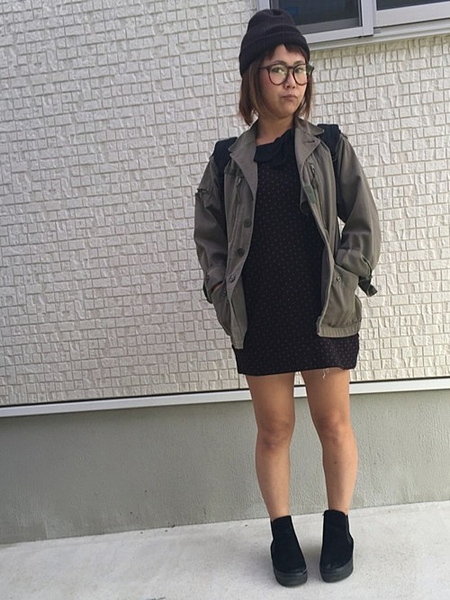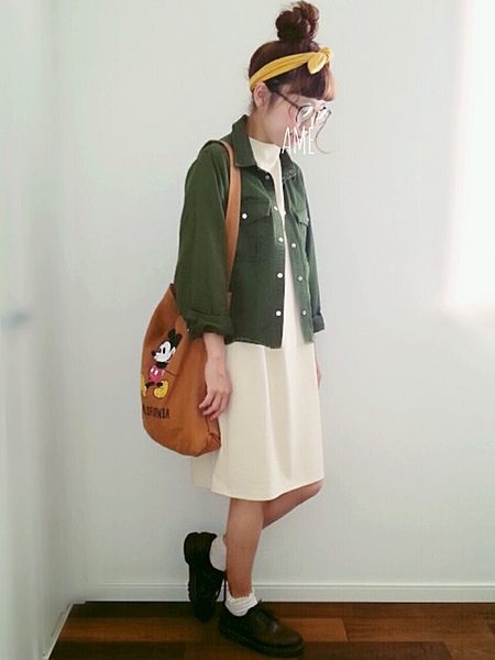 真っ白な可愛らしい印象のワンピースをミリタリーテイストでくずしたスタイル♪