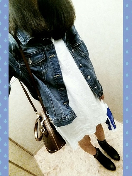 タイトなワンピースにデニムが引き締まります。