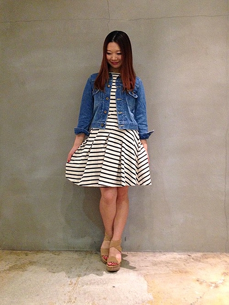 ボーダーとの相性も抜群。サンダルを履いてガーリーに。スニーカーで雰囲気も変えられます。