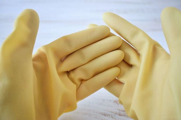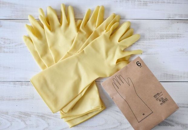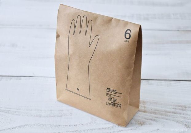 「天然ゴム手袋」は、ゴム手袋のイラストが描かれたクラフト紙袋入り。あえて「〇双」と書かれずに「6pcs(6枚)」となっているところに、秘密があります!