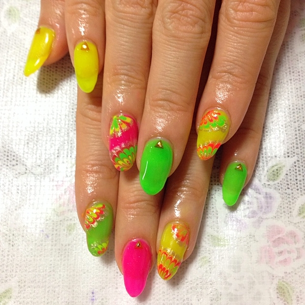 グリーンとイエローの組み合わせが可愛いピーコックネイル。色の組み合わせで可愛いお爪にしましょう。