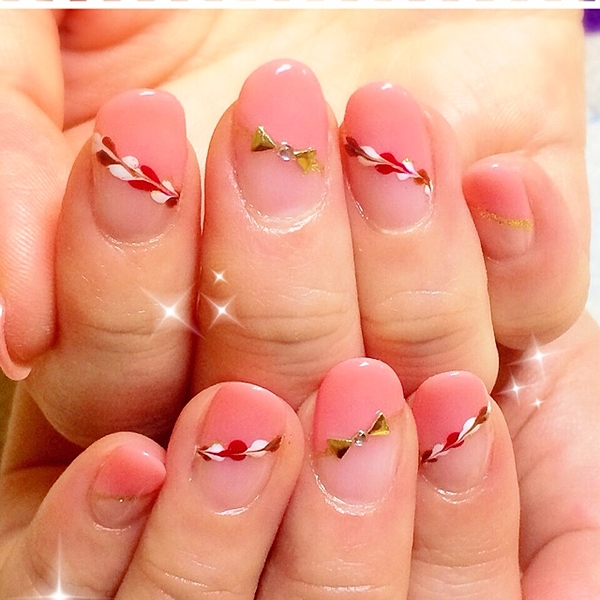 ピンクの同系色で作る逆フレンチピーコック。上品なお爪になりますね。星のくりぬきを流れるように置くとさらに可愛いです。。
