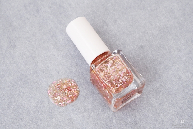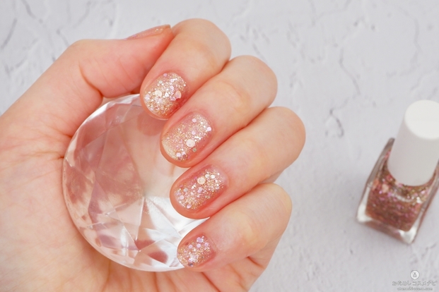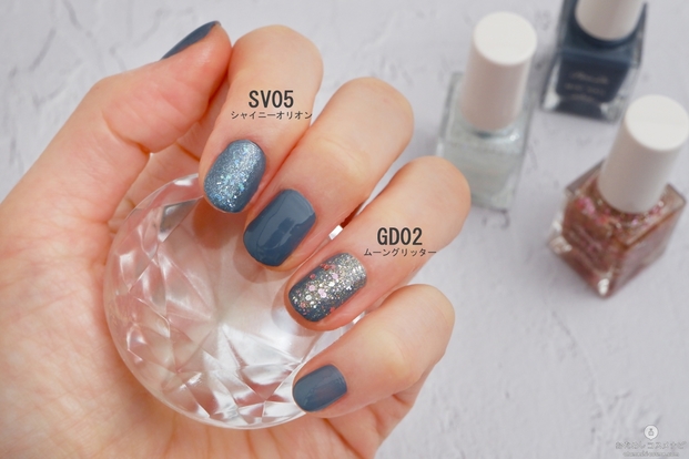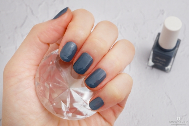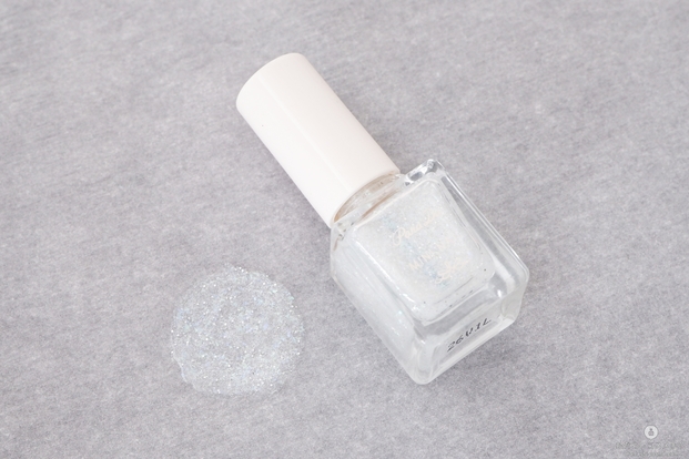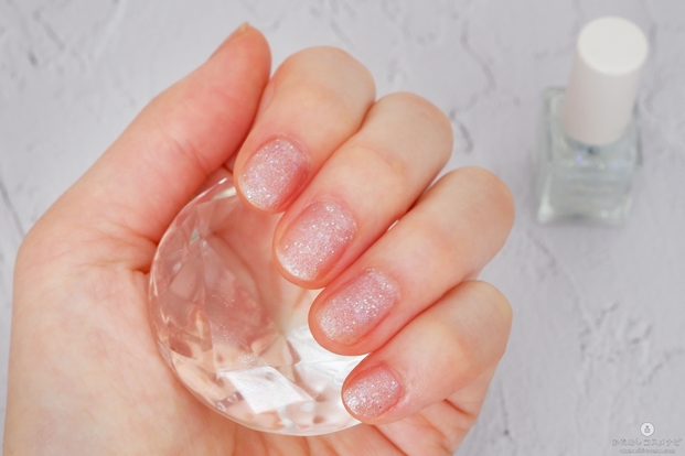 爪に塗ってみると、青みのあるシルバーラメが白っぽく輝き、繊細さがあり可愛らしい雰囲気に。