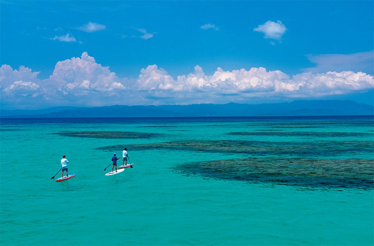 さて、ここまでは少々優雅なステイ旅だったので、小浜島では思い切りアウトドアへと繰り出すことにしよう。カヌーとサーフィンの中間のようなSUP(サップ/スタンドアップパドルボード)で海に漕ぎ出せば、足もとは目の覚めるようなウルトラマリンブルーの世界。