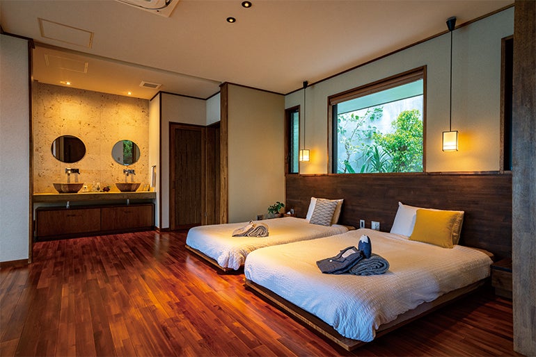 常に笑顔を絶やさない宮城さんの陽気なキャラクターもあって、我が家に帰ってきたような気分。客室はローベッドを配したフローリングに琉球畳の小上がりから成り、同じ間取りの客室がプールを経由して鏡合わせになっている。最大大人6名まで宿泊可能なので、3世代ファミリーやグループ客にも人気だという。
