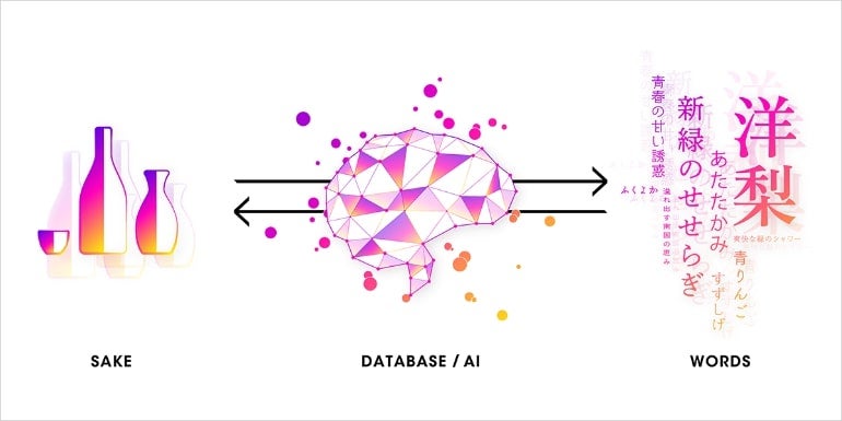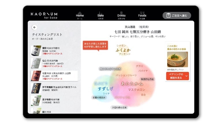 インターネット上の膨大な言語表現と、人々の香りの感じ方を学習した、香りを言語化する最先端のAIシステム「KAORIUM」に、日本酒の風味情報とユーザーの1万以上の感性データと、酒ソムリエ・赤星慶太氏の感性を融合させることで、“日本酒ソムリエAI”として進化した。