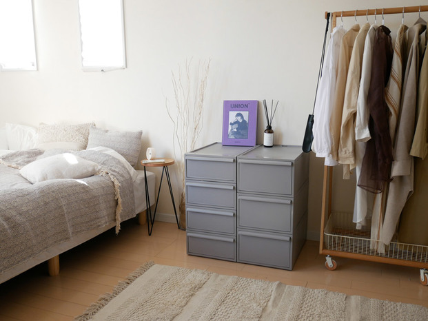 スマホや時計、ティッシュなどベッドサイドに置きたいなら、このおしゃれな突っ張り棒がおすすめです。狭いスペースでもOKで、テーブルやフックなどを自分好みにカスタマイズできます。