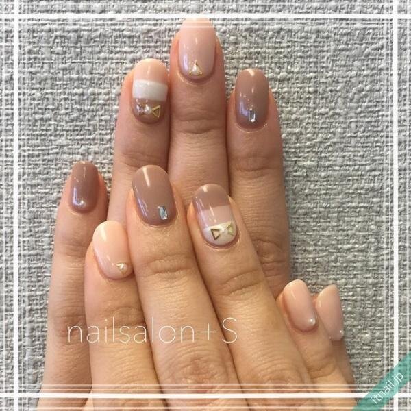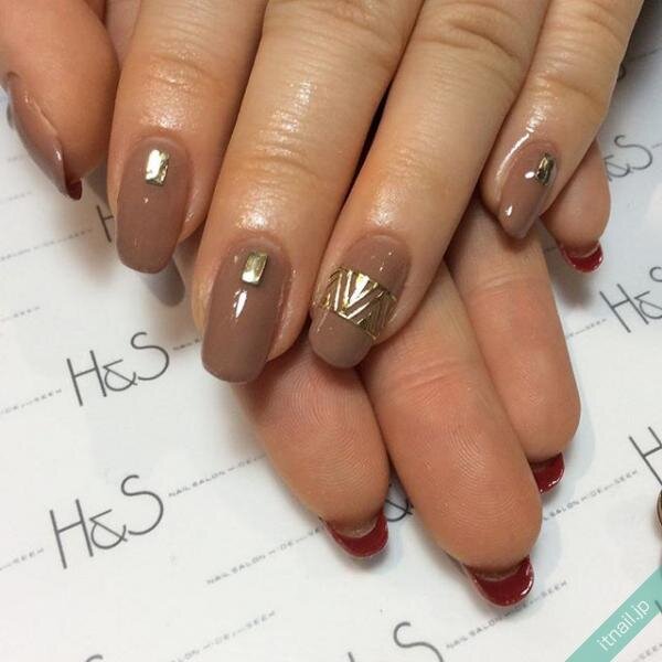カフェカラーにさり気なくパーツをプラスしたいなら、ゴールドをチョイス。カフェカラーと同系色のゴールドを使えば、主張しすぎずおしゃれな指先の完成。