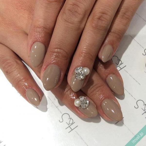 肌馴染みがよく、シンプルになりがちなカフェカラーネイル。その存在感を引き立ててたいなら、大きめのビジューを乗せてみましょう。