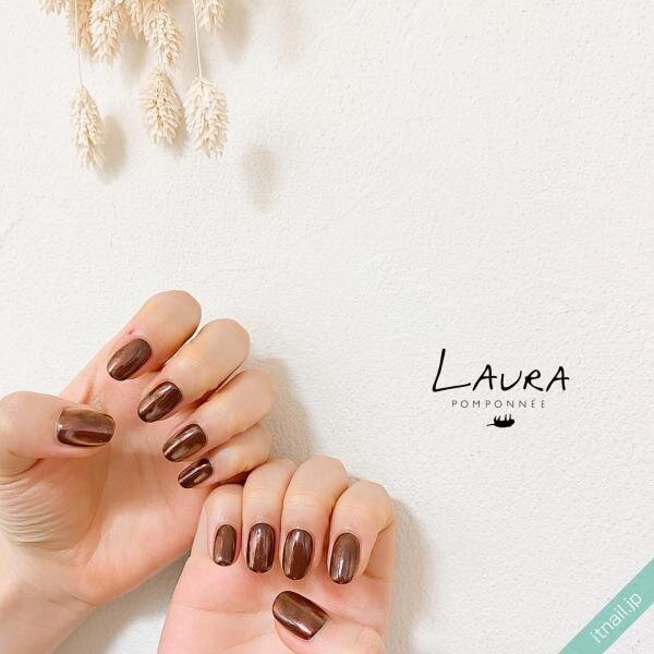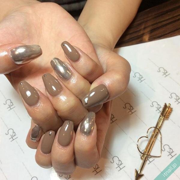 一般的にふんわりとした印象をあたえてくれるカフェカラーですが、ちょっぴり辛口に仕上げたいならミラーネイルと組み合わせてみかしょう。