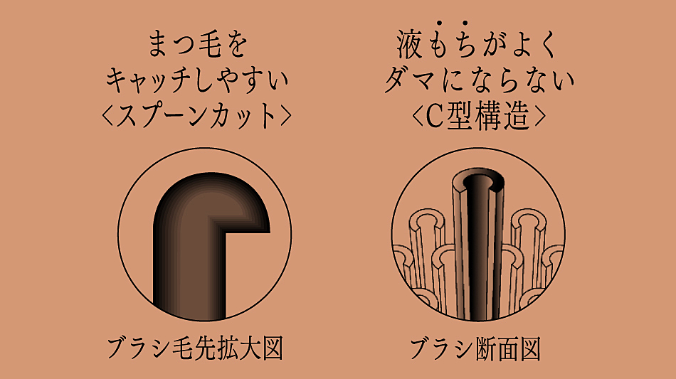 断面を横から見ると耳かきのように引っかかりがある形状になっており、目頭目尻のいつもほっておかれている短いまつ毛までも立ち上がらせることができます。