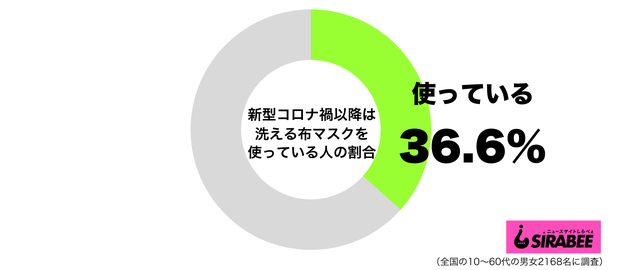 しらべぇ編集部が今年7月に全国10〜60代の男女2,168名を対象に実施した調査でも、全体で36.6%の人が「コロナ禍以降は洗える布マスクを使っている」と回答している。