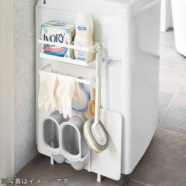 洗面周りは狭いスペースに色々なものを置かなければならないから、ごちゃごちゃしがちですよね。洗濯機の側面を有効活用できる収納ラックなら、洗濯洗剤や掃除用具などもまとめてすっきりできますよ。