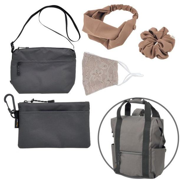 リュック、ショルダーバッグ、ポーチ、ターバン&シュシュ、マスクの5点セットです。